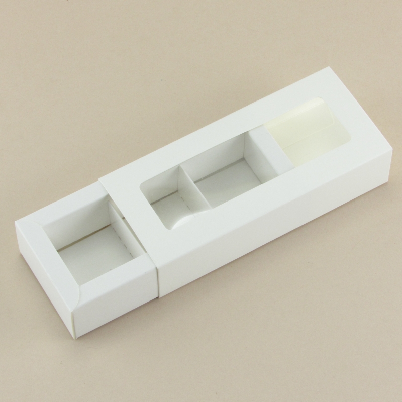 Коробка на 3 конфеты с фальшбортом белая/крафт с окном (12,2*4*3 см)