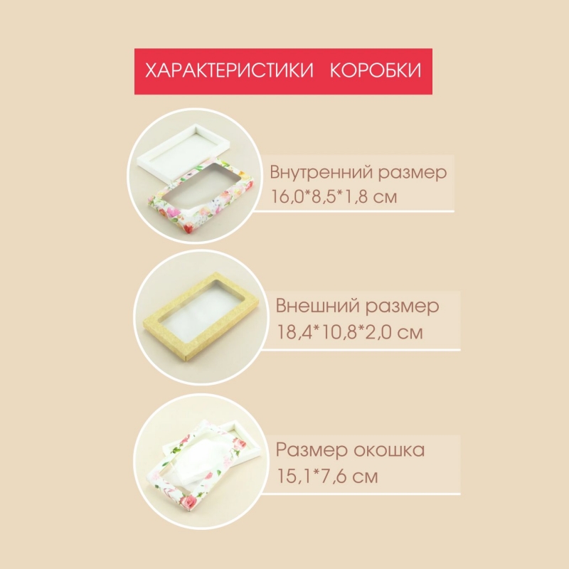 Большое прозрачное окно (15,1*7,6 см): Максимальный обзор вашего изделия. Покупатель сразу видит форму и декор шоколада, что повышает доверие и желание купить.