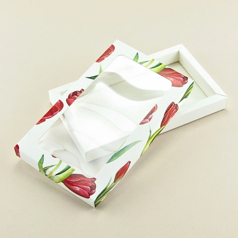 Уникальная конструкция (эксклюзивно для кондитеров): Главная особенность коробки для шоколадной плитки с окном— дно с фальшбортом. В отличие от обычных плоских коробок, такое дно создает эффект подложки, визуально приподнимая шоколад. Это выглядит дорого и презентабельно, придавая упаковке премиальный вид.
